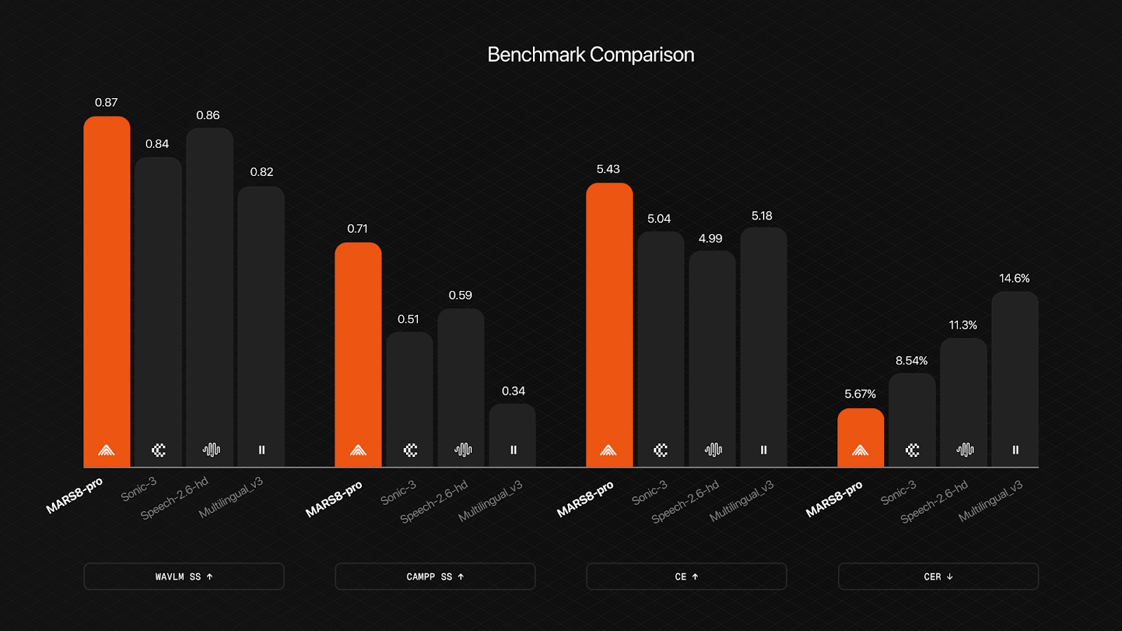 MARS8 demonstrates consistent superiority across the dimensions that matter most for production deployments: