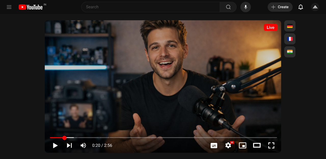 Convierte una única transmisión en directo en una transmisión multilingüe. Dobla tu audio en directo y llega a audiencias de todo el mundo en YouTube, Twitch, X y cualquier plataforma de streaming.