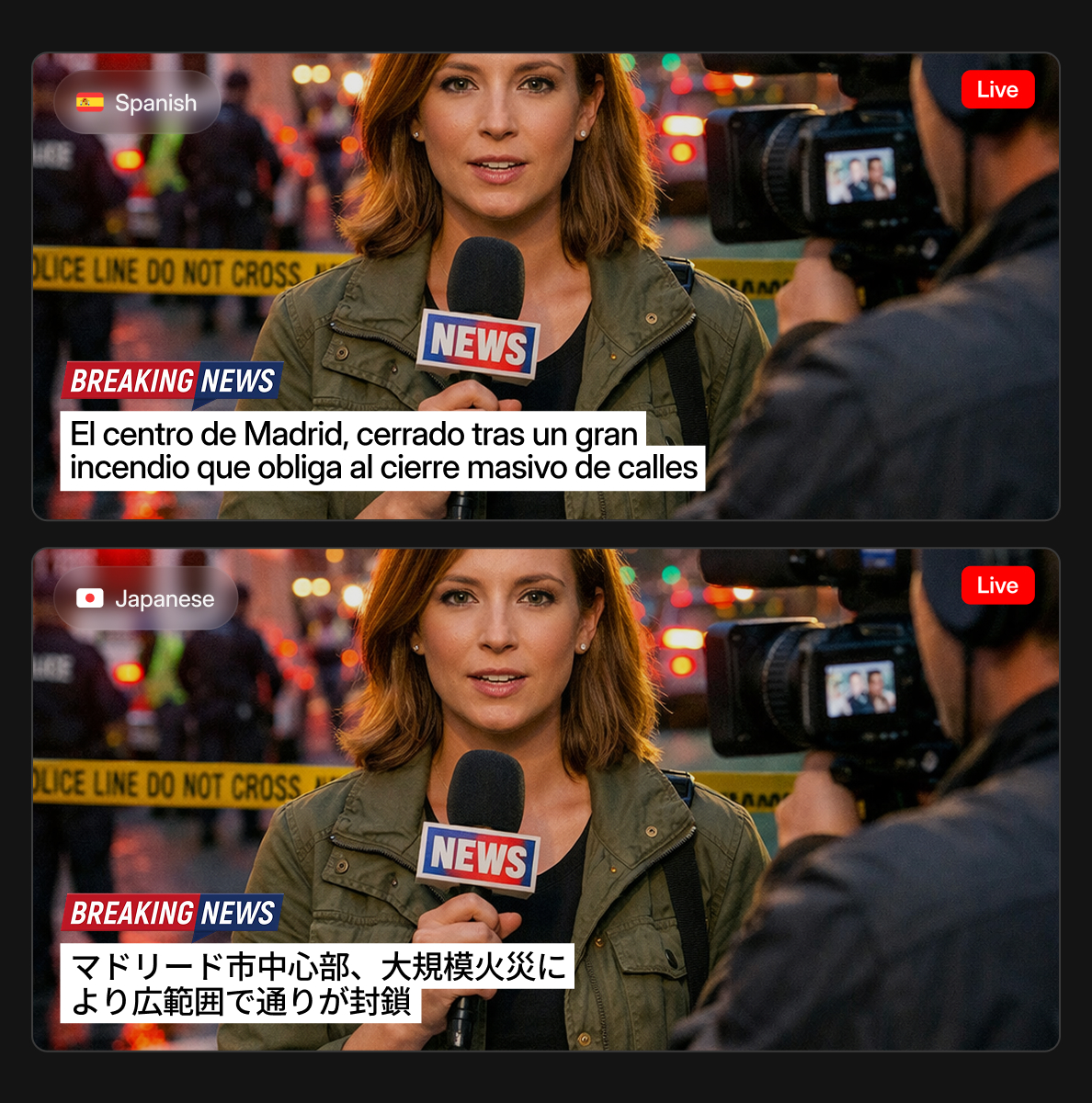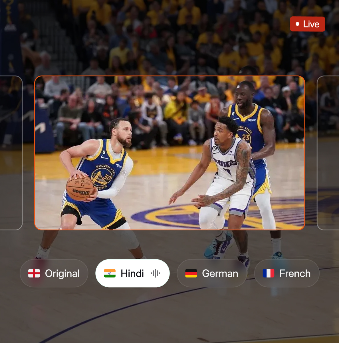 Ya sea que transmitas para fans, espectadores o millones de personas en todo el mundo, la transmisión en directo multilingüe elimina la barrera del idioma, sin cambiar la forma en la que se emite en directo.
