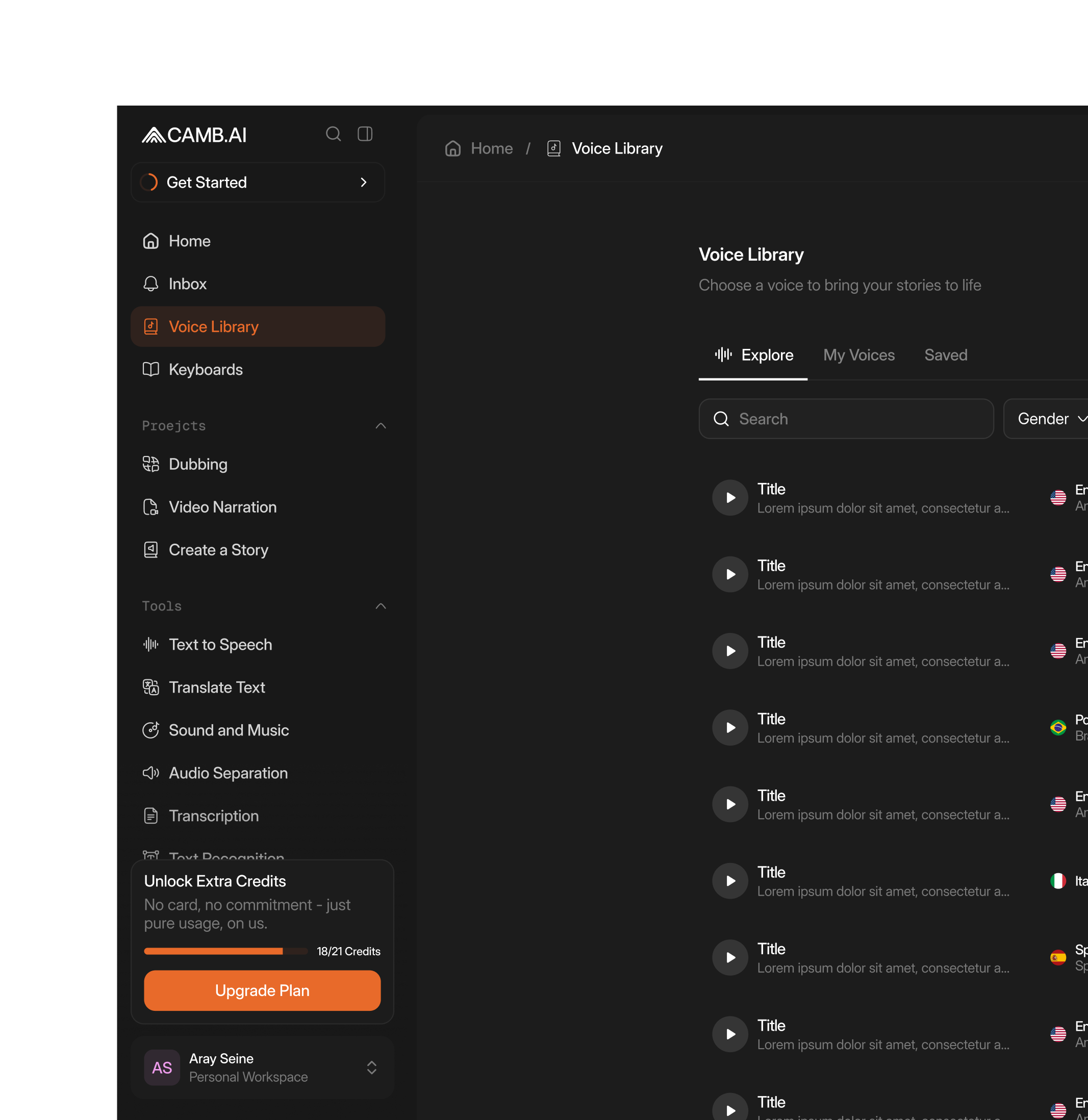 CAMB.AI's Voice Library lets you store cloned and generated voices for consistent reuse across dubbing, text-to-speech, and audiobook production in 150+ languages.